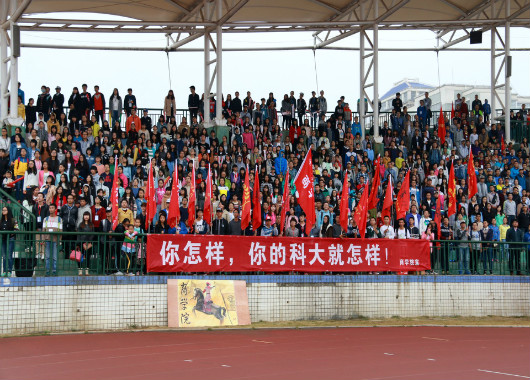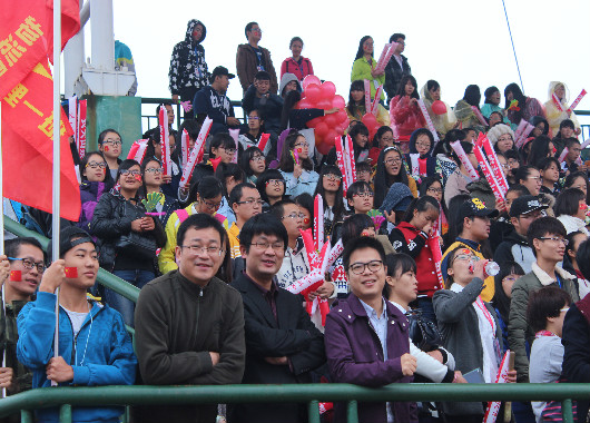 “你是我天边最美的云彩,让我用心把你留下来——留下来!”寒风瑟瑟、雨点骤大,正当全场在寒风中“静默”之时,商院观众席间却以鼓点为奏,激情四射地笑唱《最炫民族风》和《种太阳》,振奋“士气”的同时,以娱乐舒缓寒风冷雨带来的沉闷压抑的氛围。而每每赛事将近,商院观众席火热得要掀翻全场,红旗如浪般舞动。“东风吹,战鼓擂,我们商院怕过谁!”“商院出场,势不可挡!”伴着轰隆隆的大鼓声,他们时刻在呐喊、在助威,“咚、咚、咚”声响彻云宵,回荡在整个赛场。观众们一边敲打加油棒,一边高呼口号。他们脸上贴着红心,手中挥舞小红旗,神采飞扬,为每一位商院运动健儿加油打气?!吧萄г海佑?!商学院,加油!”
