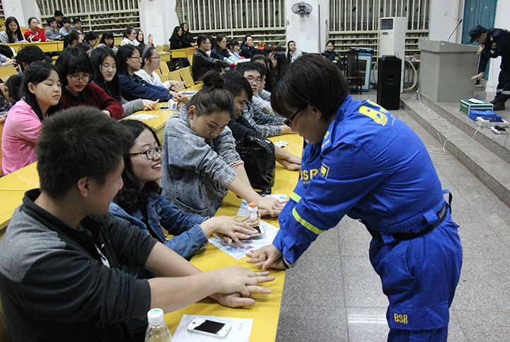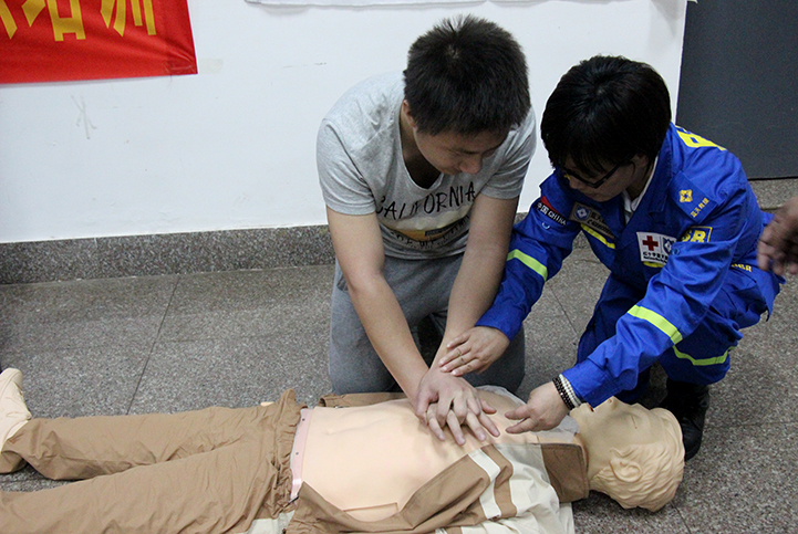 蓝天救援队队长对心肺复苏操作程序详细介绍了评估环境、判断意识、紧急呼救、调整体位、判断呼吸、胸外按压、开放气道、人工呼吸8个步骤。并手把手对在座的同学按压方式进行教导。同学们纷纷上台操作,热情高涨。