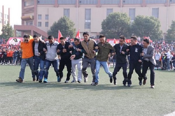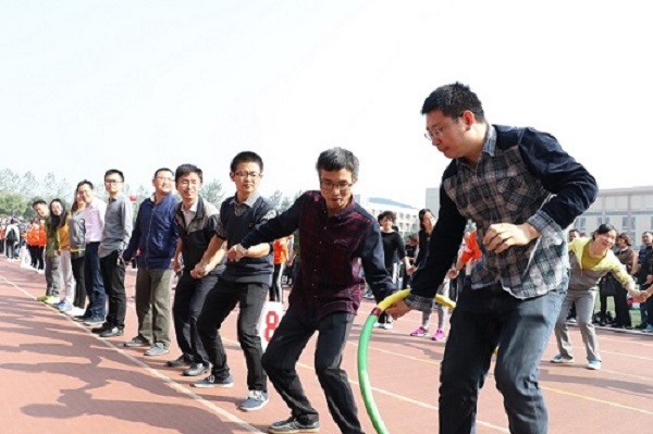 在第一个比赛“蛟龙出海”中,土木工程学院派出清一色的男队员,他们手挽手,整齐的喊着口号。经过一遍遍的练习后,步伐也由最初的凌乱不协调变得整齐划一,最后快速冲向终点,赢得比赛的第二名。第二个比赛“快乐传递”,土木工程学院派出的是男女组合。他们灵活的穿过呼啦圈,最终也顺利完成比赛。第三个比赛项目是“同心协力”,六个人集体跳绳,齐喊口号,统一上跳,起跳、落地,老师们仿佛变成了一个个舞者,不论年龄,只跟着绳的节奏有条不紊地跳动。50多岁的王丽老师也在跳绳的队伍中,身手矫健似少女,活力满满。