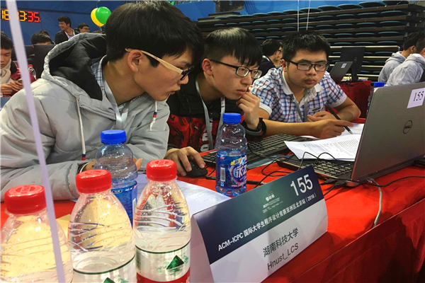 2016年11月12日至13日,ACM-ICPC国际大学生程序设计竞赛亚洲区北京站现场赛(2016)在北京大学举行。我校派出ACM代表队HNUST_LCS(计算机学院15级王春、计算机学院15级袁泉、资安学院15级王智杰)参赛。