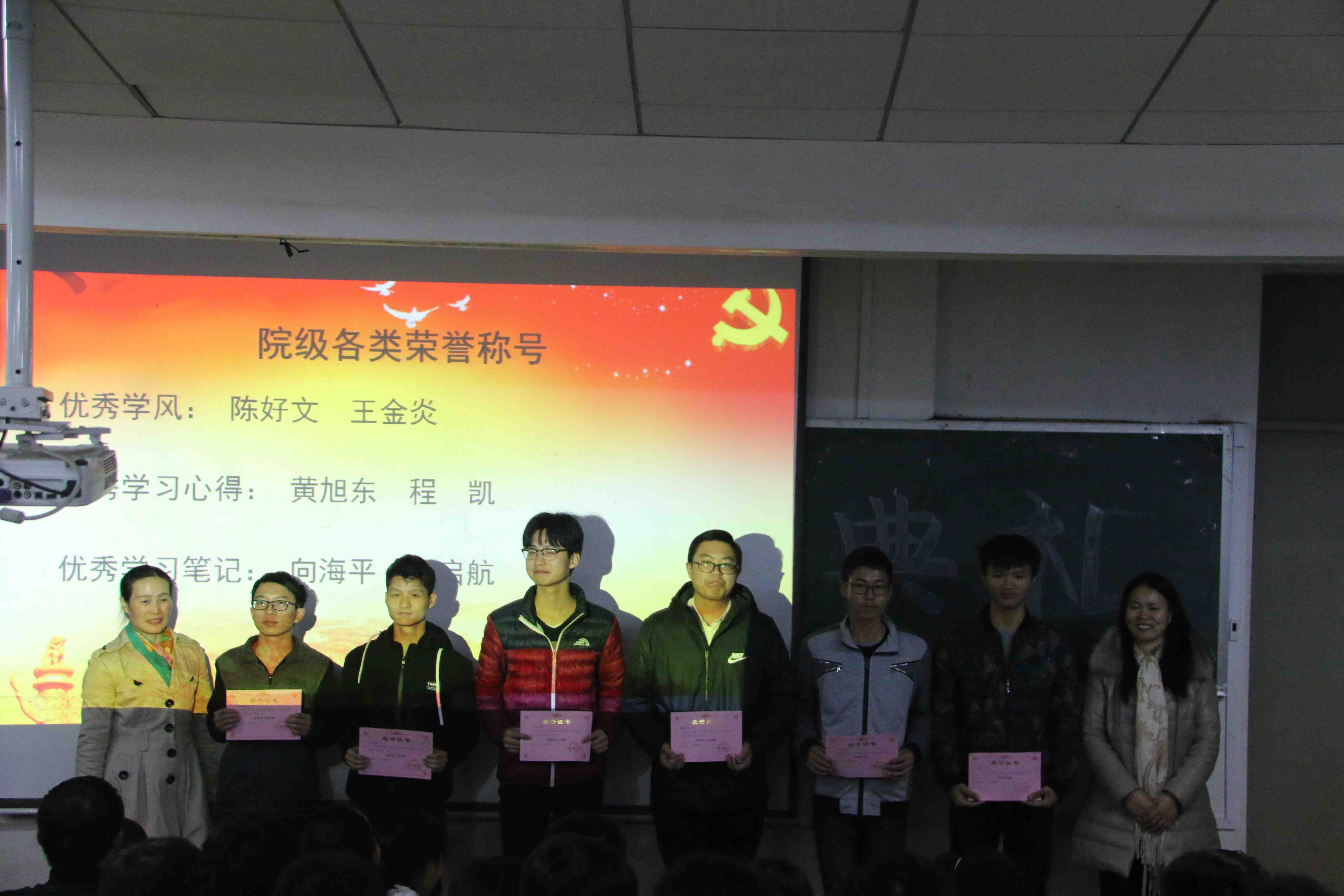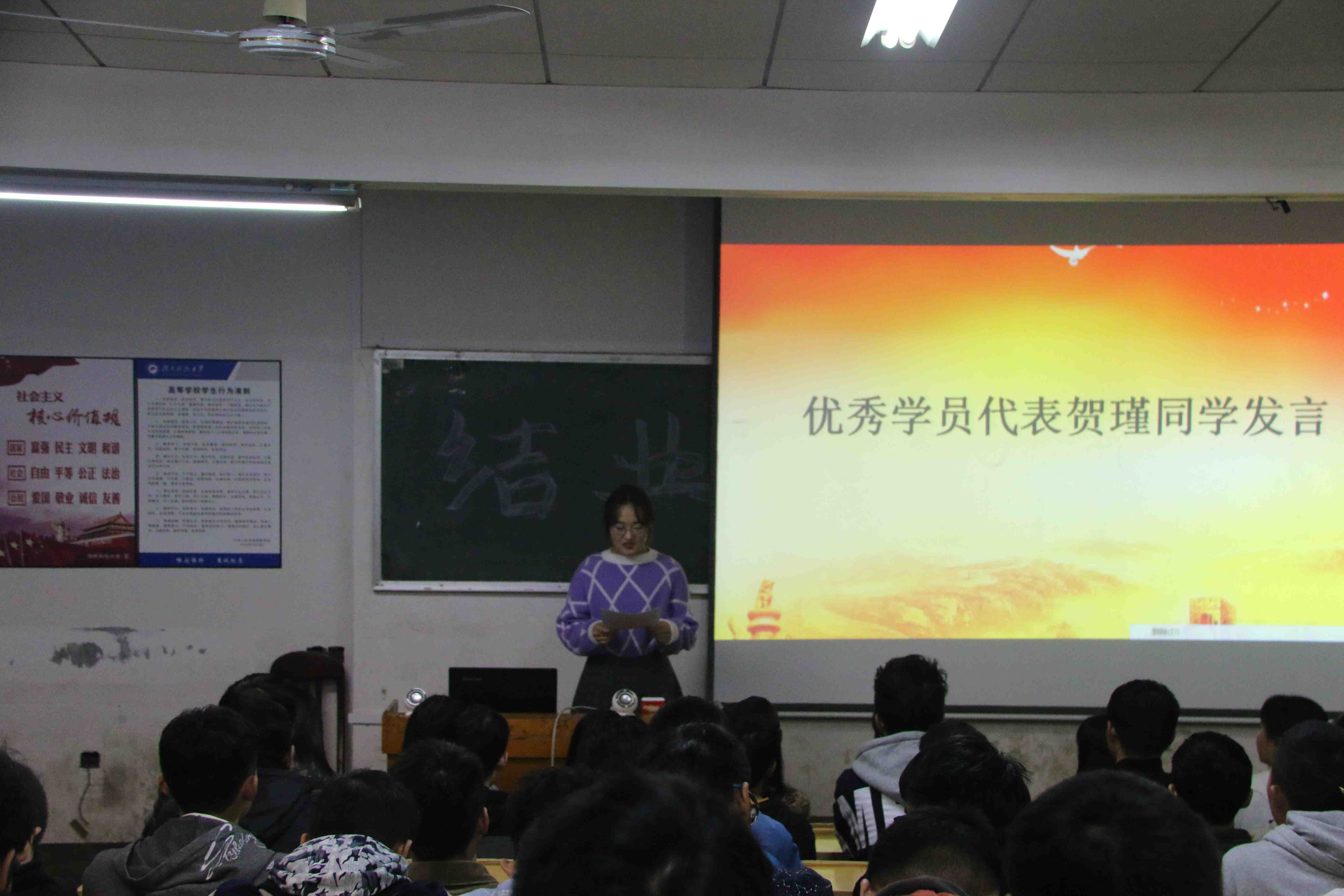 结业典礼在激昂的国歌中拉开序幕?;嵋橐潦?,肖善芳对本期培训班作总结,并向学生党建会干部以及培训班班长、组长和各位同学表示感谢。她既肯定了积极分子的努力和表现,也提出了存在的问题。同时她简要介绍了党员发展的基本程序和条件,为入党积极分子指出了前进方向,提出了宝贵建议。随后本期培训班优秀学员代表贺瑾同学发言,她表示近一个月的培训使她获益匪浅,将在接下来的学习工作中发奋图强、努力向党组织靠近。最后肖善芳和潘美玲为校级优秀学员以及获得院级各类荣誉称号的同学颁奖并合影留念。