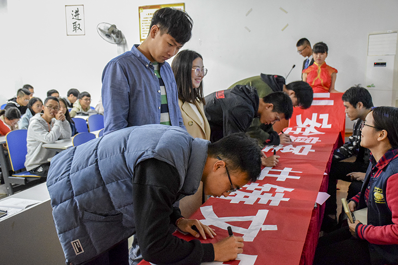 活动最后,各位老师和主席团成员在活动横幅上签字,并由主席团成员向各班团发放《安全管理规定承诺书》。至此,本次安全文明宣传月启动仪式圆满结束。