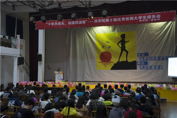 4月24日19:00,由商学院团委基金会承办的“十年共成长,相遇同温暖”优秀贫困生报告会在南校活动中心举办。商学院党委副书记吴帅锋,团委书记彭小光,团委基金会指导老师雷芳,团委学生会主席团代表,其他兄弟学院代表以及14级部分学生参加了此次报告会。阮凯斌、李嘉欣、秦莎等八位优秀贫困生代表相继进行自我报告。