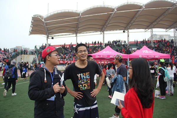 比赛还尚未开始,场上的气氛却是格外的活跃,各个学院都不甘落后,加油声嘹亮高昂、持续不断。运动员们在跑道上做着热身运动,脸上的表情或轻松或严肃,但更多的是自信。随后,裁判员一声“各就位”,全场的气氛变得十分紧张,然后枪声一响,运动员们就像离弦的箭一般飞了出去,短短的十几秒爆发出了他们所有的能量,观众场上的呐喊声已经略显沙哑。土木学院的唐君宇同学取得了决赛第五名的成绩并接受了采访。他说道:“对自己的成绩不是很满意,比平时跑得慢了,没有掌握好比赛节奏,但是我很享受这个赛场??吹秸饷炊嘌У苎酶颐羌佑痛蚱娴暮芸?,很感动。有机会一定会参加明年的比赛?!背性刈叛г喝儆乃档秸饫锏氖焙蛳缘酶裢饧ざ⒈泶锪硕云渌硕钡淖T浮?br>