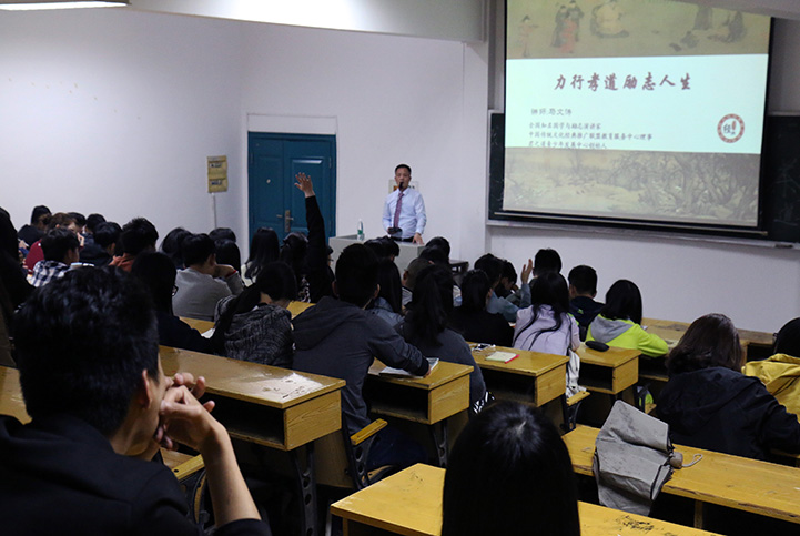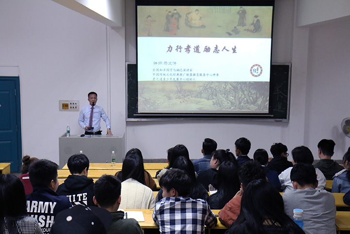 本次讲座以“力行孝道,励志人生”为主题,讲师主要阐述了“力行”的基本含义以及什么是孝道,我们又应该如何尽孝道,围绕这三个方面讲述分享了“孝感动天”、“亲崇汤药”两则孝道故事。从儒家、道家、佛家三个角度分别阐明了孝道的由来,告诫我们尽孝道晓之以要理,述之以恩德,明之以因果。