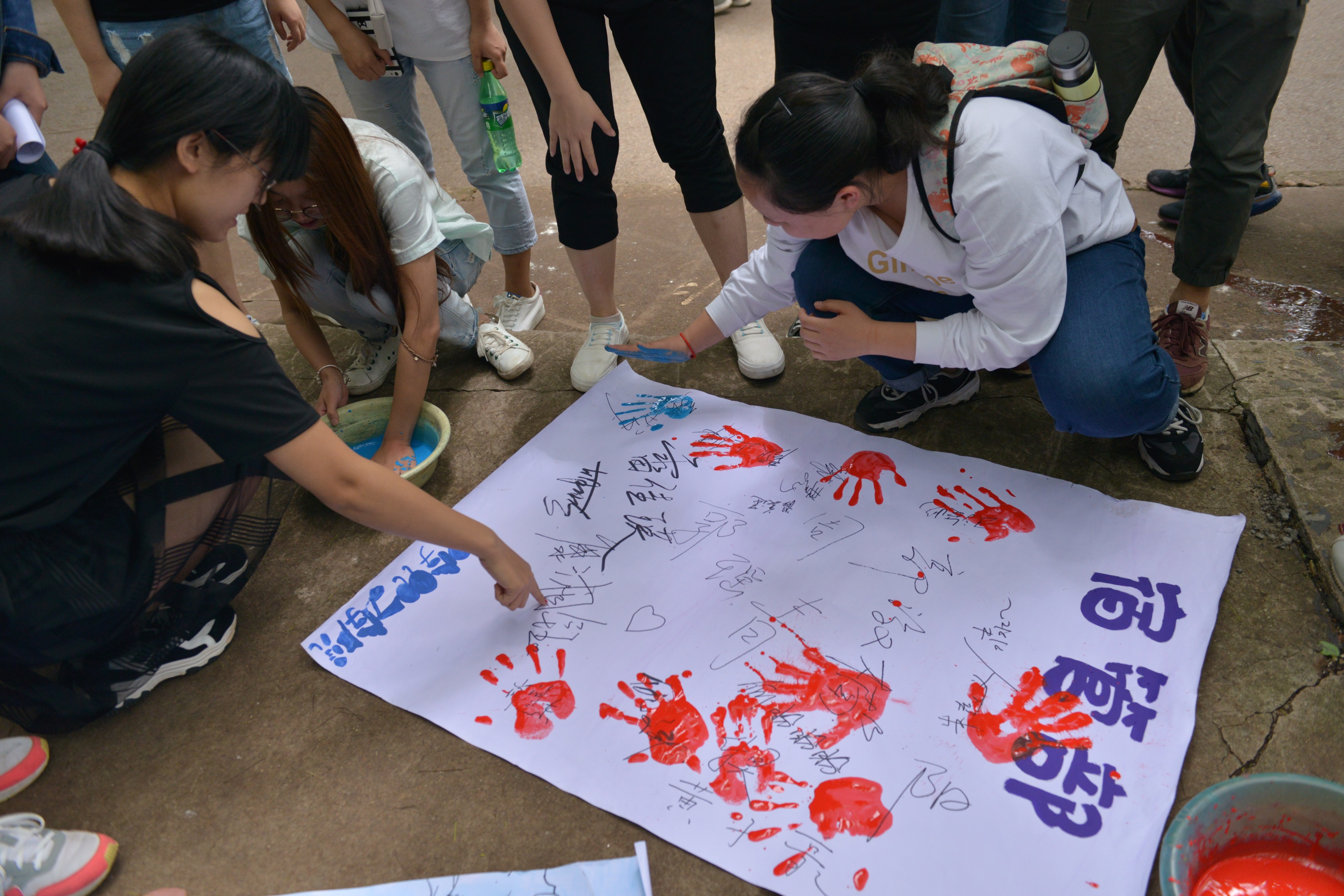 活动前期,宣传部人员进行场地布置,把近一年的海报悬挂展览,并为每个部门都准备了特色海报。展出海报十分精美,引得路人频频驻足。中午达到活动高潮,各部门成员相继到场,一起涂鸦、签名,在海报上印上各色手印,并合影留念。各部门派出代表参与游戏,各参与者分工合作,通过语言描述,猜出并找到所选中的海报,考验了部门成员之间的默契程度。