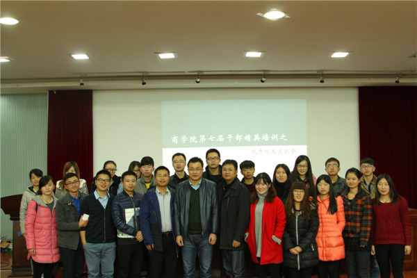 12 月14日 15:00,以“践行核心价值观,实现青年自强”为主题的商学院第七届干部精英培训之优秀校友交流会在三教101召开。商学院05级学生会主席陈英睿、团委副书记李佳和黄滔作为优秀校友代表就如何进一步提高学生干部的综合素养,实现青年自强分享了自身的经历与看法。我院党委副书记吴帅锋、团委副书记彭小光、11级辅导员丁文彬以及12级团委学生会副部长及以上干部参加了此次交流会。