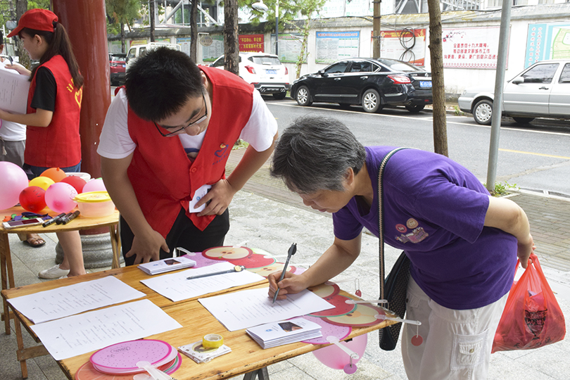 抵达社区后,志愿者们在社区工作人员黄英的指引下开展志愿活动。志愿者们两两分为一组对社区周围居民进行网络知识宣传手册的分发和不同年龄段网络问卷调查的填写,在填写调查问卷时,志愿者们对居民们详细的说明了此次社会实践活动的主题“网络教育”,并积极鼓动大家参与到此次活动中去,了解网络,督促孩子正确使用网络。