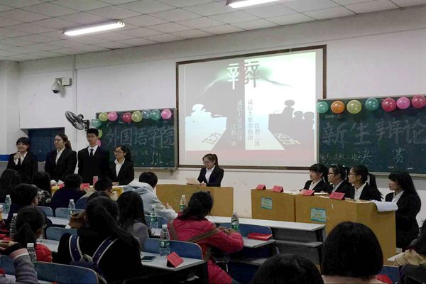 12月4日晚7:30,外国语学院新生辩论赛决赛于第八教学楼3-3教室顺利举行,汉语国际教育专业一班与二班的辩论代表队围绕“诚信主要靠自律还是他律”展开激烈辩论。比赛邀请到法学院赵曜、商学院宁环雪、土木学院石丰源和林俊贤以及外国语学院陈奇担任评委,现场气氛热烈,座无虚席。