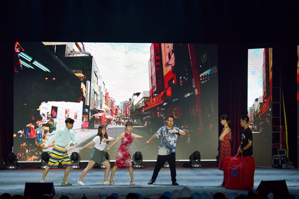 热辣的开场舞,开场舞以爵士为主要表现形式,舞蹈节奏和背景音乐不断变换,再加上舞者们炫酷靓丽的外形,使现场沸腾不已。第一站,新加坡。新加坡作为一个旅游胜地,给人的感觉是欢快的,一把吉他,一把贝司,一架架子鼓,艺术团团长郑习婷动感的歌声,将歌曲《第一天》的欢快演绎到极致;新加坡也是给人惊喜的,在观众以为表演即将结束时,画风一转,乐队又为观众演唱了《只有音乐才是我的解药》,优美的声线,激情的架子鼓,完美无懈的配合,给了观众最美的惊喜。E城带给观众的是小品《贷价》,它紧扣当下社会热点问题但又不失小品的诙谐幽默,讲述了一对学生情侣因过分追求物质享受而陷入校园贷款泥潭的故事。该作品讽刺了过度追求物质享受的畸形价值观和当下各种校园贷款的奉献,通过揉入《江南皮革厂》等娱乐元素,让观众在欢笑的同时,得到警醒和教育。台北,带给我们的是舞台剧《我们的时代》,该舞台剧以学生成长的心路历程为主线,配上台湾青春主题电影,用现代舞诠释了青年成长的不同阶段,背景音乐节奏快,风格多样,给人一种独特的艺术体验。