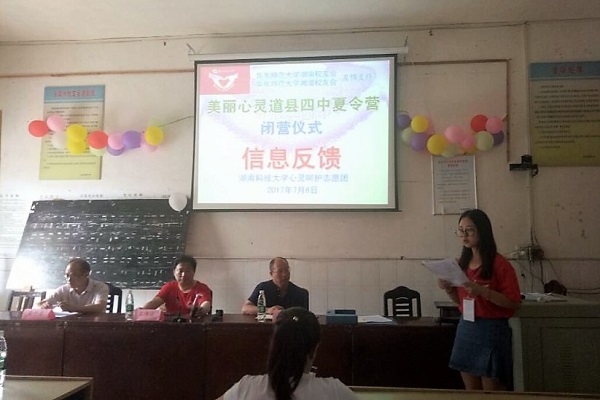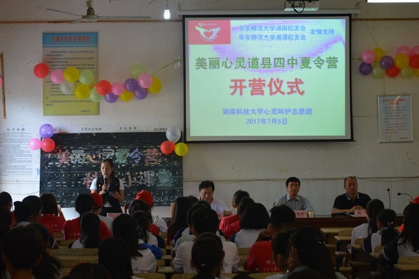 2017年7月4日,在湖南科技大学留守儿童心灵呵护志愿团创始人兼指导老师王伟清教授的带领下,由教育学院6名研究生和17名本科生组建的志愿服务队伍赴永州市道县四中开展暑期三下乡“美丽心灵”志愿活动,本次活动意图通过为近百名被试对象开展心灵呵护活动以促进学生的心灵健康和提高品性发展水平。
