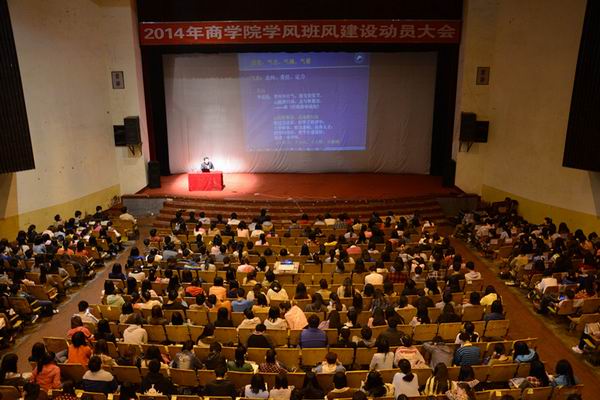 为加强学风建设,贯彻党的群众路线方针。在结合学生们近期反映的问题后,商学院分别于4月27日分8:30和14:00在南校俱乐部举办了两场2014年商学院学风班风建设动员大会。会议由商学院党委副书记吴帅锋主持,院长向国成应邀担任主讲,团委书记彭小光、各年级辅导员及商学院11级、12级和13级所有学生分批参加了此会。