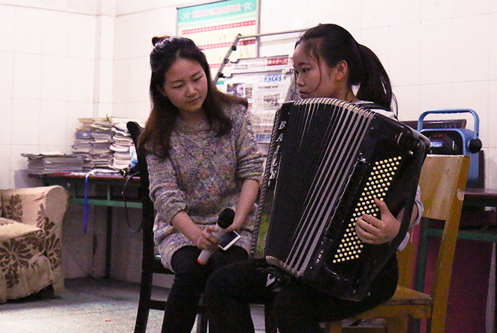 随后,我们邀请老人们到演出厅观看演出,同学们纷纷施才献艺,为老人们献上了精心准备的文艺节目,如手风琴《贝加尔湖畔》,歌曲《十送红军》等,为活动增添融洽和谐的气氛。在这里,岁月的斑驳似乎随着我们的节目显得愈发轻了些,他们仿佛蜕下束缚的躯壳,像个少年般欢呼呐喊手舞足蹈,更有自发上台献唱的奶奶,艺惊四座,赢得了全场的热烈掌声。