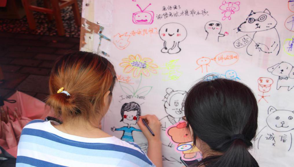 当天,在老师们的指导下,人文学院勤工助学部精心布置摆点场地,吸引了一众学生参加活动。通过参与“正话反说”“你画我猜”“气息挑战”“数字挑战”等游戏、“诚信墙”、涂鸦活动,同学们赢得精美的奖品,参与活动的积极性提高。参与者在横幅上签名、在”诚信墙“上用便利贴留下自己对诚信的想法、在涂鸦板上画下独特的画作。在欢声笑语中,填满名字的横幅、贴满话语的“诚信板”、色彩纷呈的涂鸦板,体现了大学生们对诚信的深刻理解以及想成为一名诚信者的坚定信念。