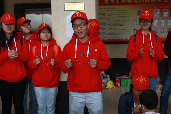 早上9:00,搭载着志愿者们的热情与爱心的公交车缓缓停靠在湘潭市社会福利院的门前,在经过与福利院行政科科长王斌的一系列沟通后,他提到:“你们周中来的话会有更多的活动可以开展,我们周中都会安排孩子们去学习,做游戏等。周末一般都是给孩子们休息的时间。”在福利院内,志愿者们将准备好的礼品送给小朋友们,并且组织志愿者为小朋友们表演节目。唱歌、舞蹈、舞台剧等等,现场志愿者与孩子们其乐融融,欢声笑语一片。