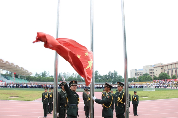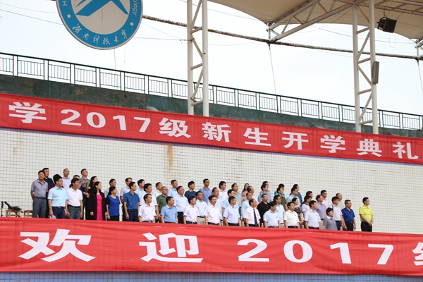 开学典礼第一项,升国旗。我校国旗班的同学在全体老师及新生的注视下,护送国旗并升起国旗。数万人一同注视国旗的场面十分壮观。随后是校长李伯超讲话,李校长首先是对新生表示欢迎,在短暂的欢迎后,校长语重心长地和同学们说起大学是一个锻炼人的地方。在大学可以学到很多东西,还可以积累人脉。这些在以后的学习、工作中都是特别有帮助的。
