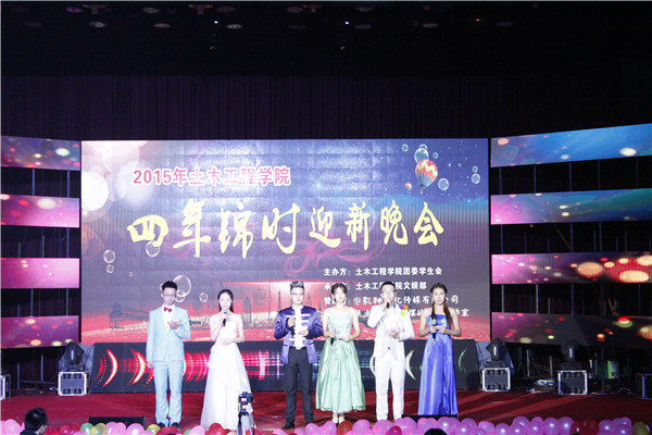 为迎接2015级新生的到来,展现土木学院学子风采,12月4日晚上7:00,由土木团委学生会文娱部承办的“四年锦时”迎新晚会在南校俱乐部隆重举行。土木学院党委副书记易贵元,学工办主任虢利钢,“就业爸爸”皇晓东,杨钋平,曾淑艳,刘星,赵晓玲,汪建群等老师出席了此次迎新晚会。