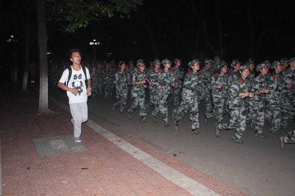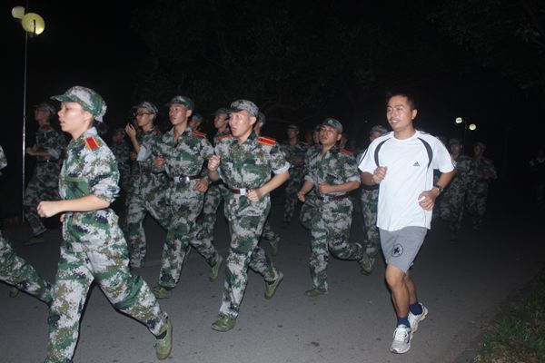 9月28日晚上7:30,刚结束了白天在烈日下的军训,新生们又开始了晚上的体能训练——围着桂花园跑十圈。因担心新生们第一天军训承受不了如此大强度的训练,助班们纷纷加入了训练队伍中,陪新生们跑步,给他们加油鼓劲。