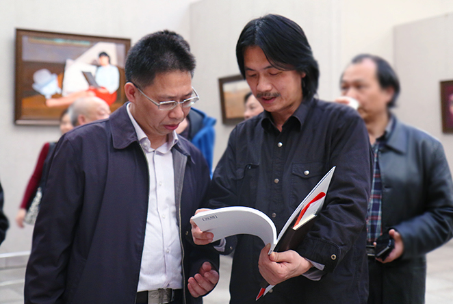 4月13日16时,艺术研究和课题申报学术座谈会在美术楼203举行。中国书法家协会理事、湖南省书法家协会主席、湖南省文化厅副厅长鄢福初主讲,副校长刘友全出席并主持了本次学术座谈会。本次学术座谈会还特邀艺术学院原院长曾景祥、杨国平,著名艺术家王志坚、省文化厅倪文化、省博物馆王集、著名收藏家王薇等特邀请嘉宾,出席本次座谈会的还有艺术学院院长李毅松、党委书记张琳、副院长邹正洪、尹建国等教师及其他艺术爱好者。会议开始前,一行人先参观浏览了艺术学院彭浩同学的油画毕业展,并给予了高度的肯定与赞赏,刘友全副校长,杨国平,曾景祥教授纷纷题字赠言,欢声笑语,其乐融融。