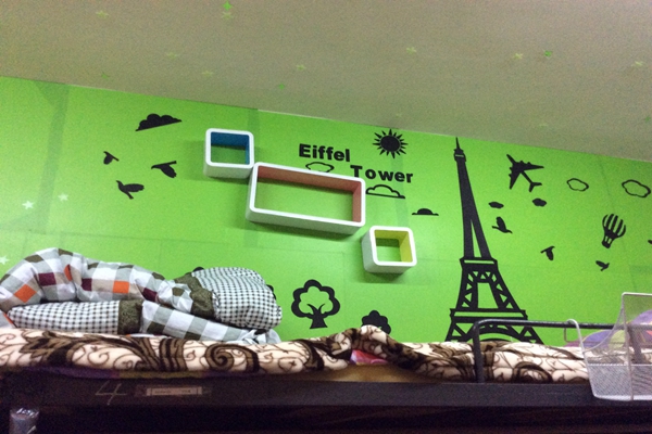 每个寝室风格迥异,14级建筑学专业女生422寝室将建筑钢笔画融入到寝室装扮中。地理信息专业的女生寝室521更是收集了学校的枫叶与绿叶制作成床帘,独具自然气息。地理科学专业的女生621寝室用小木棍搭成门牌,门边爱心形状的照片墙记录着她们每天幸福的寝室生活,心灵手巧的她们,更是手工制作了彩色花与千纸鹤垂落在寝室中央。