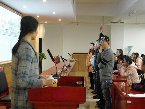 比赛伊始,主持人开始宣读比赛规则,在第一环节,从每队1号选手起轮流抽题号答题。场下的参赛选手逐个起立答题,为各自的班级赢得了相应的加分。第二环节中,比赛题目变换成冒险题,其中,填空题所占比值略重,每题30分,答错则扣相应分数,现场氛围开始紧张,当主持人问及纪律处分、五个综合奖励,单项奖励,集体奖励类型等问题时,各班派出各自的代表站在台上根据屏幕上的不同题目举手抢答,并与场下观众积极互动。随着主持人喊完“一二三”,场上6位选手分秒必争,迅速举手?!扒胛剩D诠潭ǖ那诠ぶЦ谖怀杲鹈咳嗣吭乱话阄?50至多少元,每一小时酬金原则上不低于多少?”主持人问道,选手们略显犹豫,思政2班的参赛选手尹华龙立刻举手做出正确回答。