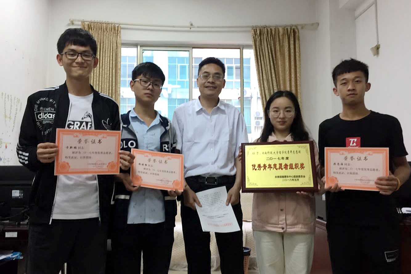 2018年5月10日,湘潭市中心医院庆“五一国际劳动节”、“五四青年节”、“五一二国际护士节”暨五四评优表彰大会上,湖南科技大学商学院青年志愿团荣获2017年度 “优秀青年志愿者组织奖”,志愿者赖忠海、彭晓静、杨金来、姚修怡、方新鹏获得 “湘潭市中心医院优秀志愿者”称号,由共青团湘潭市中心医院委员会为我院颁发荣誉证书。