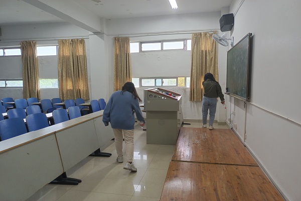 3月19日到20日,青年战“疫”突击队精心组织、周密安排,有序开展对第三教学楼的疫情防控工作,站岗组志愿者负责在教学楼门口站岗,严格检查登记通行人员的健康码、行程码,把守好教学楼疫情防控第一关;消毒组志愿者负责对整栋教学楼进行全面消毒,他们拿着消毒工具穿梭在各个楼层,教室、楼道、走廊都活跃着志愿者们的身影。他们弯下腰,对准每一个风险点,摁下喷洒按钮,来回喷洒,先内后外,全面覆盖。持续的工作让他们面色泛红,但他们依旧坚毅专注,坚守岗位。志愿者们一间教室一间教室地消毒擦拭,一个楼层一个楼层地巡视检查,用行动诠释着青年的使命担当,他们化身“红马甲”、“红袖章”,为商学院师生的安全健康筑起了一道防护墙。