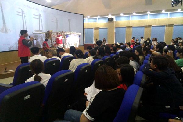 为了使纸影更好的进入大学生的生活,学校特地选出视觉传达二班的部分同学为在场观众表演。他们的剧本名为“太浪三迁”,运用大量网络用语把太浪母子俩的三迁表达的生动而有趣,特别是后面太浪的妈妈在收到一个陌生小女孩充满善良的花后受到启发决定资助山区儿童,富有正能量又不失搞笑,在视觉传达的同学们表演完后吴渊先生又邀请在场的其他人上台体验纸影的魅力。