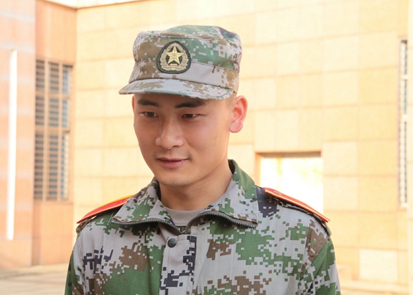 一营一连十排,旅管专业一班新生刘伟涛,2014年9月入伍,2016年9月从中国人民解放军75260部队退役,拥有两年的从军经历。由于教官要训练方阵队成员不能兼顾本排学员,本可以免训的他毅然接下了“副排长”这个担子,“是有点累,但是为了学院效力,不在意”。