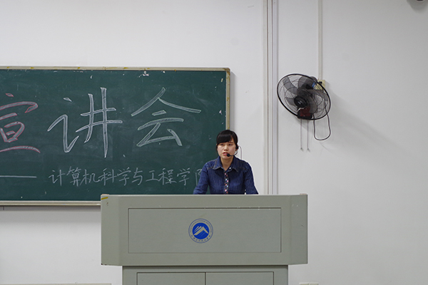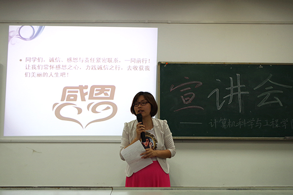 5月25日晚7点30分,计算机科学与工程学院在一教203教室举行了“诚信·感恩”宣讲会议。资源环境与能源安全学院刘德碧老师应邀宣讲,校资助办邵美珍老师、计算机科学与工程学院辅导员陈苗苗出席,计算机科学与工程学院16级贫困生、贷款生,校自理勤工部以及院勤工部成员与会。会议由陈苗苗老师主持。