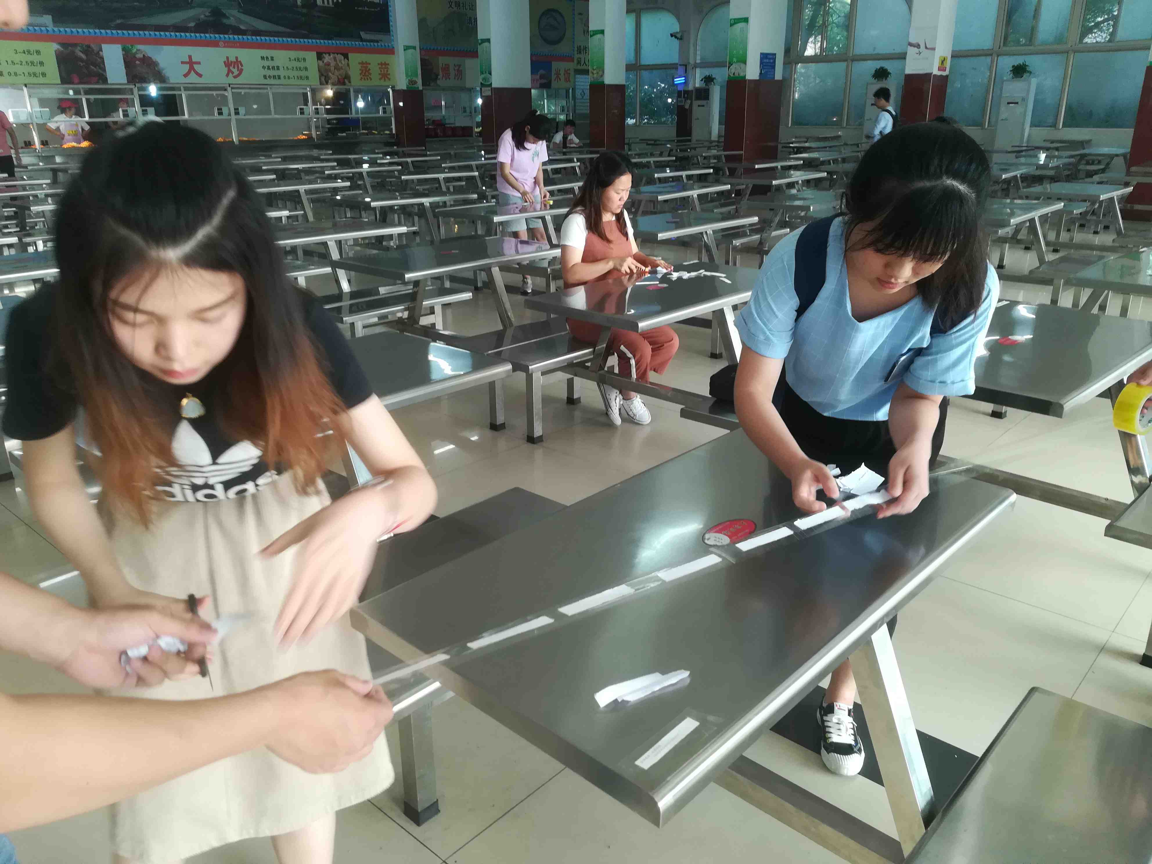 讨论结束后,大家共同前往二区、三区食堂开展实践活动。为了让同学们弘扬节俭的美德,本次实践活动内容采取了在食堂桌子和柱子帖粘贴相关宣传标语的形式。学员们拿着提前准备好的标语、胶带,井然有序的到各自分配好的食堂开始工作。通过同学们不懈努力,现在食堂的很多桌子上都已经贴上了“一粥一饭当思来之不易,一丝一缕恒念物力维艰”等宣传标语。这次实践活动不仅让同学们认识到了粮食的重要性,也促使大家养成节约意识和良好的饮食习惯。