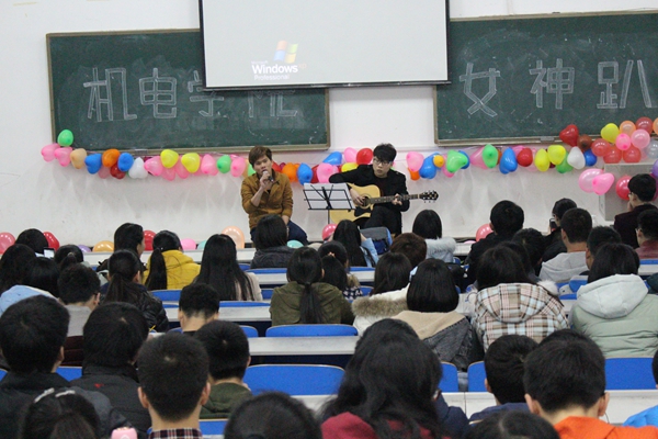 走进晚会现场,大屏幕上正播放着机电男生对女神们的祝福视频,还没正式开始的晚会就洋溢起种种幸福的味道。在举办晚会之前,女生部便已经收集了机电女神们的愿望,本次晚会过程中,主持人随机抽取了现场的男生,在愿望箱中抽取女神的愿望并要当场实现。李乐学长就当场为一名幸运的女神演唱了《王妃》。王开亮学长唐荣茂学长同台弹唱《南山南》,女高音韦婷惠也上台献唱《小幸运》为女生节晚会喝彩。《你比我猜》的游戏中女神们和男生之间的高度默契让台下的观众惊叹不止。晚会的压轴节目,由机电学院宣传部自导自演的《吃面》小品又将晚会推向了另一个高潮。最后,经过男生们的票选,何宇茜当选了晚会美丽女生。