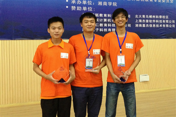 我校代表队在计算机科学与工程学院的指导老师向德生和陈燕晖的带领下,派出4支队伍参赛,其中,由周朝苑、封宇、唐汉英组成的代表队,在2015年湖南省大学生程序设计竞赛中,战胜了国防科大、中南大学、湖南大学等众多高校队伍,在124支参赛队中脱颖而出,斩获冠军,取得了历史性的突破。另外3支代表队分别获得二等奖1项和三等奖2项。另外,我校代表队团体总分在36所高校中位居第5名。