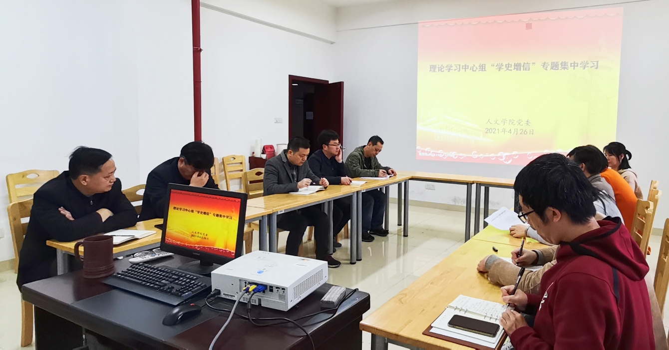 2021年4月26日上午,人文学院学院党委理论学习中心组(扩大)在立言楼B523室开展党史学习教育“学史增信”专题集中学习研讨,集中学习由李胜清书记主持,全体党委委员参加了本次集中学习。