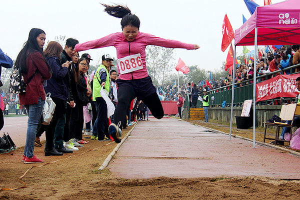 10月30日上午,在校运会学生甲组女子三级跳远的决赛现场,编号为“0886”的潇湘学院运动健儿张小贝以 9.05米的成绩荣获甲组女子三级跳远第3名。