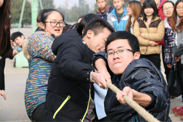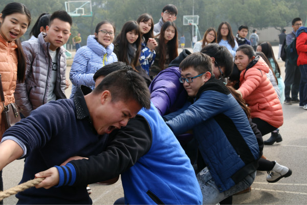 只见社联与外联的角逐被围得水泄不通,观众目光纷纷聚焦于绳两端的队员们,而队员们早已排好队形,脚顶着脚,双手紧握绳子,静等待裁判哨令。随着哨令一响,队员们应声向后倾倒,齐心用力,嘴里齐声喊着“1——2——1——2——”面目的狰狞写满了他们的团结拼搏,即使手上磨破了皮也毫不松绳。“加油,加油!重心压低!”一旁的拉拉队也为他们助威。红绳逐渐向社联那端移动,社联一鼓作气,趁势将绳子猛拽了过去。他们赢了,跳着,拍着手,欢呼着,欢乐气氛充斥整个赛场。