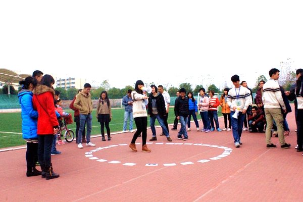 本次社团文化节在游戏“生物进化论”中拉开了序幕。“生物进化论”规则为:每个人两两猜拳,由低到高分为鱼--两栖动物--猿猴--人类四种身份,每个人从最低级开始,只能与与自己同等身份的人划拳,赢者升一级而败者降一级,以此类推。同学们都十分投入,场上的气氛极其热烈。随着工作人员的一声叫停,这数十位来自不同年级、不同学院的同学们按“物种”分为了四组,开始了“十人九足”的游戏。