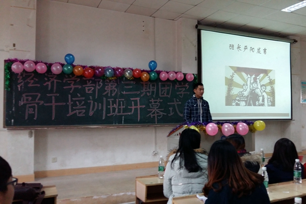 周老师对经济学部第三期团学骨干培训班开幕表示热烈的祝贺以及组织团校培训的工作人表示感谢,并为同学们提出了宝贵的意见。团学骨干班班长严阳强调本次培训班的主题:勤奋、严谨、求实、创新,并表示自己会以身作则起好带头作用,也希望其他的学生干部可以从团校培训中学到真本事。