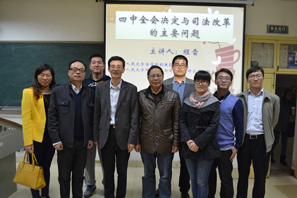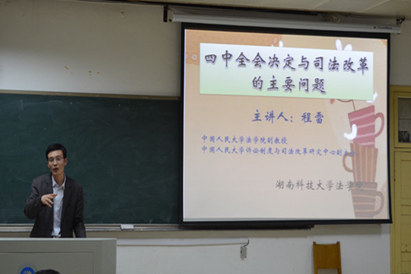 11月5日晚7:30,在十教附一304,法学院邀请到了中国人民大学诉讼制度与司法改革研究中心副主任程雷副博士,为法学院师生献上一场名为“四中全会决定与司法改革的主要问题”的讲座。法学院院领导廖加林、喻军、胡正昌,法学院老师胡之芳、毛小平、刘敏、宋智敏出席,喻军副院长主持讲座。