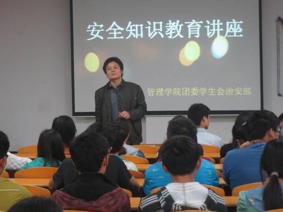 你想知道怎样在熊熊大火中逃出生天吗?你想知道如何防盗防骗吗?你想避免校园滋扰吗?4月28日晚7:00,管理学院团委学生会治安部于二教604开展了安全知识教育讲座。10级辅导员陈攀老师作为主讲老师为同学们带来了一场听觉盛宴,各年级的寝室长一起聆听了这场关于生命财产安全的教育讲座。