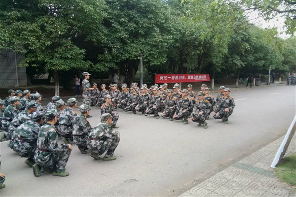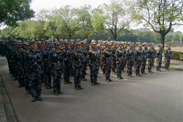 太阳底下,同学们在教官的监视下站得笔直笔直的,个个昂首挺胸,教官响亮地说:“大家站好了,不舒服的打报告......"新生们在训练场地一动都不敢动。短暂的休息时间对他们来说是多么幸福的时刻。