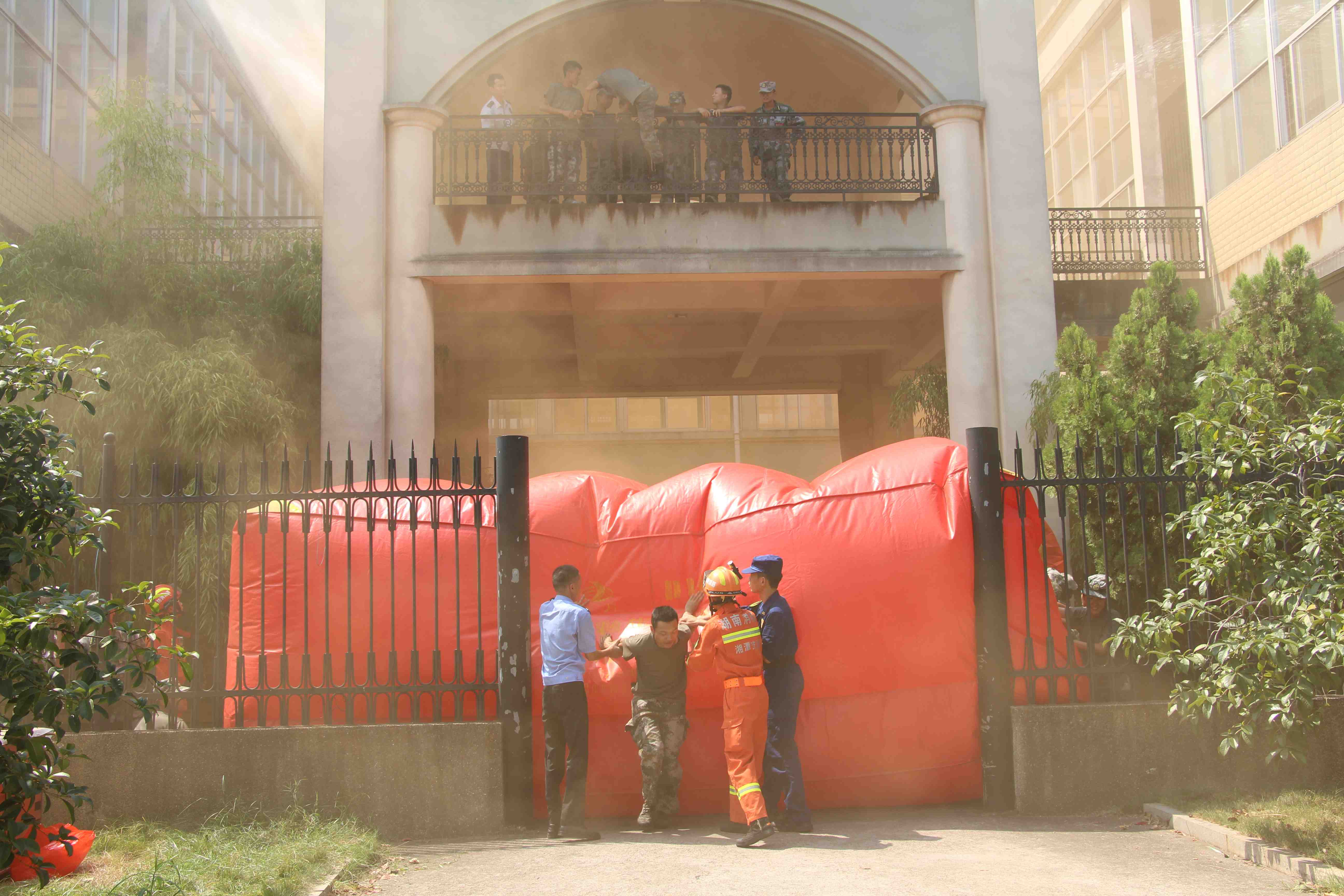 伴随着消防车警笛的响起,外语楼升起了滚滚浓烟。短短十几秒,消防队员便完成了拆卸水枪,注水等一系列动作,消防队员们手握注水枪阻止了火势的蔓延。外语楼内,数名教官跳至救生气垫来模拟火灾现场逃生过程。现场也对急救车进行了模拟,急救车在火灾发生时到达现场,并将伤员迅速送往医院救治。