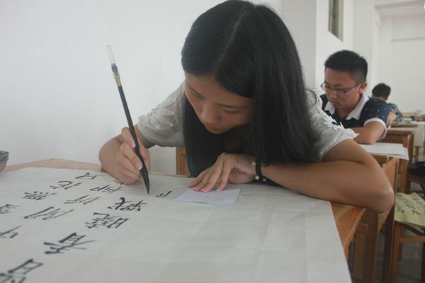 有的挥毫泼墨、飘逸洒脱,有的一笔一划、细致专注,书法组的同学均聚精会神地完成着自己的作品。比赛进行到一半,15级测绘工程专业的黄大林刚写完了硬笔书法,又拾起毛笔,写起了软笔书法;“好久没写毛笔字了,心里没底,不敢报软笔书法,但是最后还是忍不住想试试?!被拼罅滞г谌蠼邮懿煞檬彼档?。