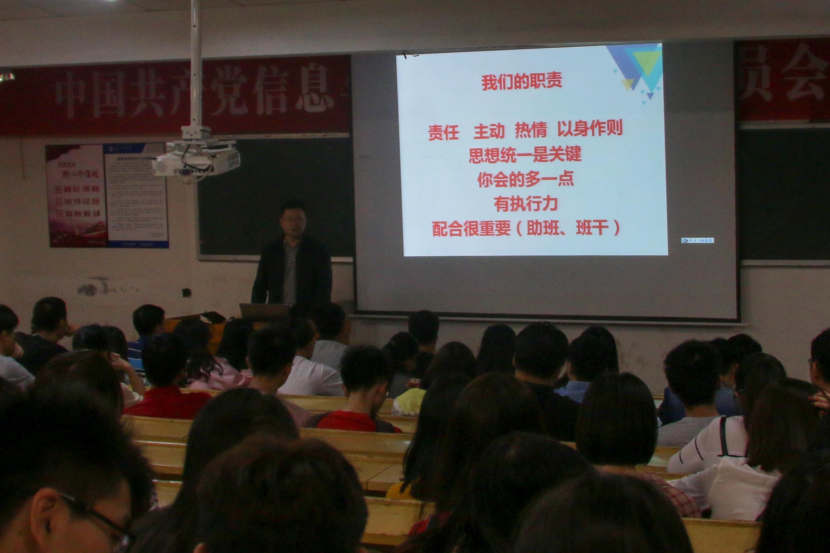 10月8日,为迎接即将到来的第二轮卫生检查,规范新生寝室内务管理,督促同学们严格按照标准整理内务,信息与电气工程学院在信息楼二合班召开了志愿者大会?;嵋橛裳г旱澄笔榧抢钅鲜χ鞒郑?7级志愿者参加。