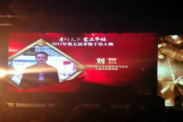 2017年湘潭市“华银杯孝文化节孝悌十佳”颁奖典礼于10月28日在湘潭市白石广场举行。市领导徐亚健、刘良廷出席了晚会并为获奖人物颁奖,颁奖典礼由湘潭市总工会、市广播电视台、湖南华银酒店管理有限公司等单位主办。湖南科技大学资源环境与安全工程学院刘韧老师获得该奖。
